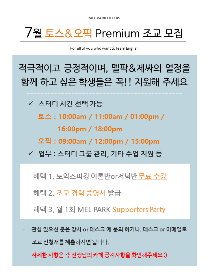 공지 | 멜팍어학원 2016년 7월 프리미엄조교 모집~!!