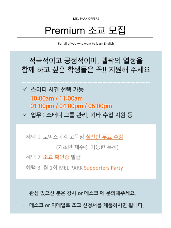 2016년 2월 멜팍어학원 토익스피킹 프리미엄 조교를 모집합니다!!