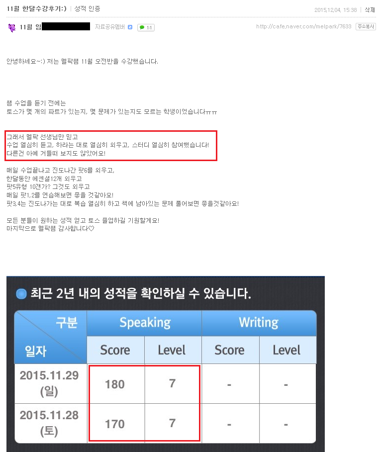 토스 | (대구토스 7급후기)선생님만 믿고 하라는대로 했더니^^ 한달 180점 7급 획득!! 페이지 정보 작성자 MELPARK 작성일15-12-07 17:04 조회4,454회 댓글0건 이전글 다음글 검색 목록 본문 (클릭 하시면 크게 보실 수 있습니다.) 수강생 후기 입니다. 더 많은 후기는 우측 카페 링크 가입 후 보실 수 있습니다. 이전글 다음글 검색 목록